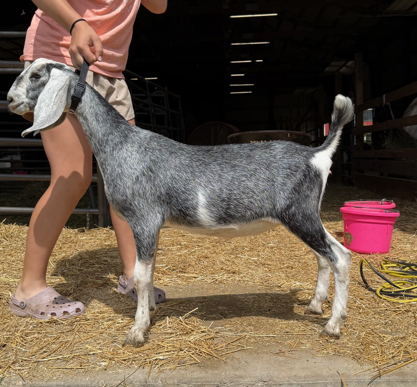 American Nubian 2025 doe kid out of Raspberry Hill Gigi RRR and Kuhtz Dream Eye Candy. Dam appraised at VVEE 89 this summer and peaked at over 14 lbs of milk. Hauled to multiple shows this summer.